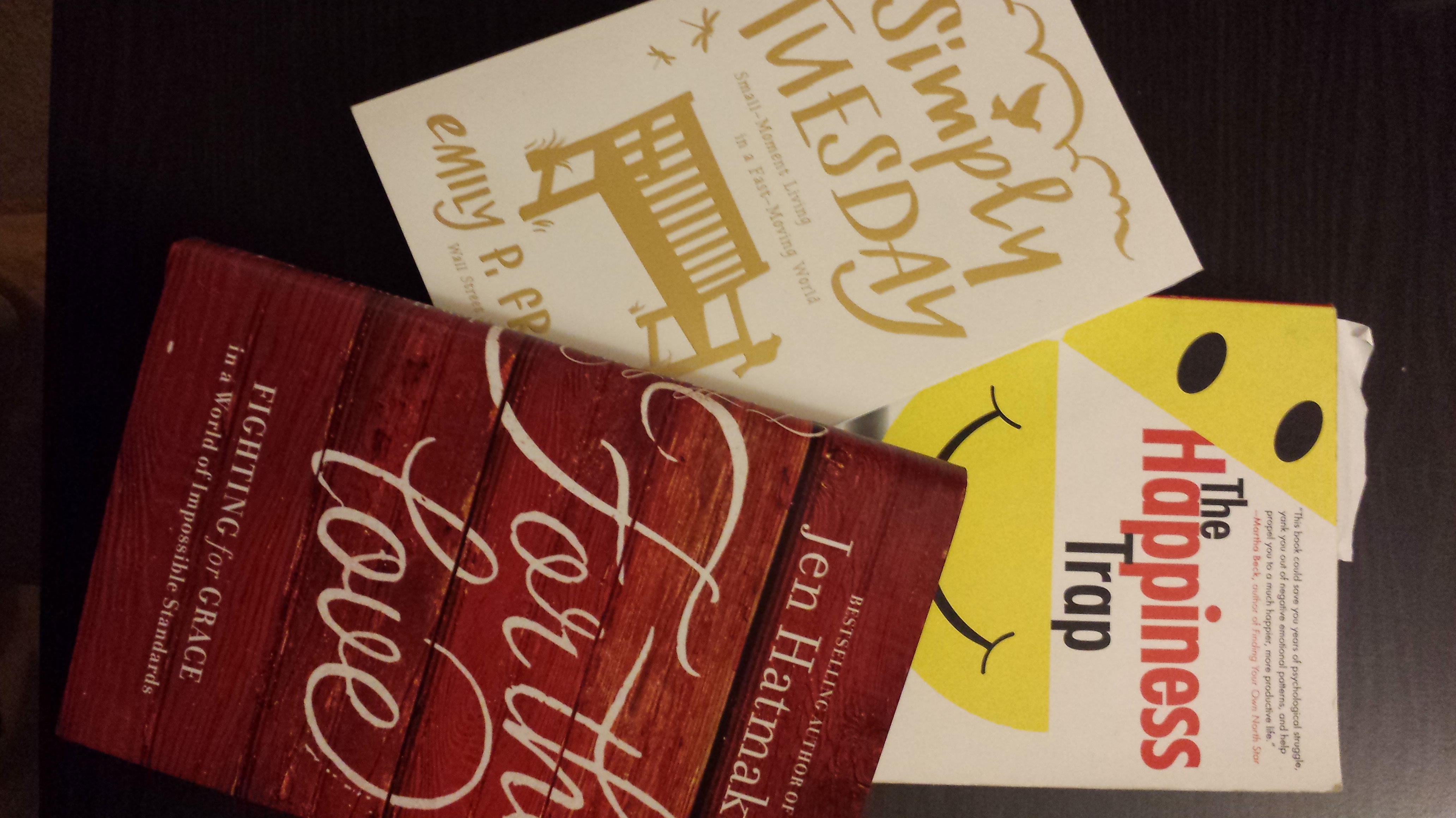Lately I have been rather selfish in my book selections, choosing to read a lot of “self-help” and personally uplifting materials. Currently on my nightstand – amongst the Bible, devotional, study book, puzzle book, Sudoku book, lotions and glass of water! – are The Happiness Trap by Russ Harris, For the Love by Jen Hatmaker, and Simply Tuesday by Emily Freeman.